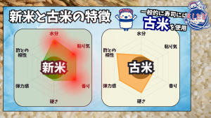 寿司には新米ではなく適度に熟成された古米が一般的には使用されています。新米は水分を多く含み、粘り気や香りが強く、お酢の吸収にばらつきが出てしまうので寿司にはあまり適していません。