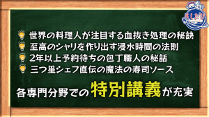 講義内容としては「世界の料理人が注目する血抜き処理の秘訣」「至高のシャリを作りだす浸水時間の法則」「2年以上予約待ちの包丁職人の秘話」「三つ星シェフ直伝の魔法の寿司ソース」など、受講生の成長を促す要素が盛りだくさんです。